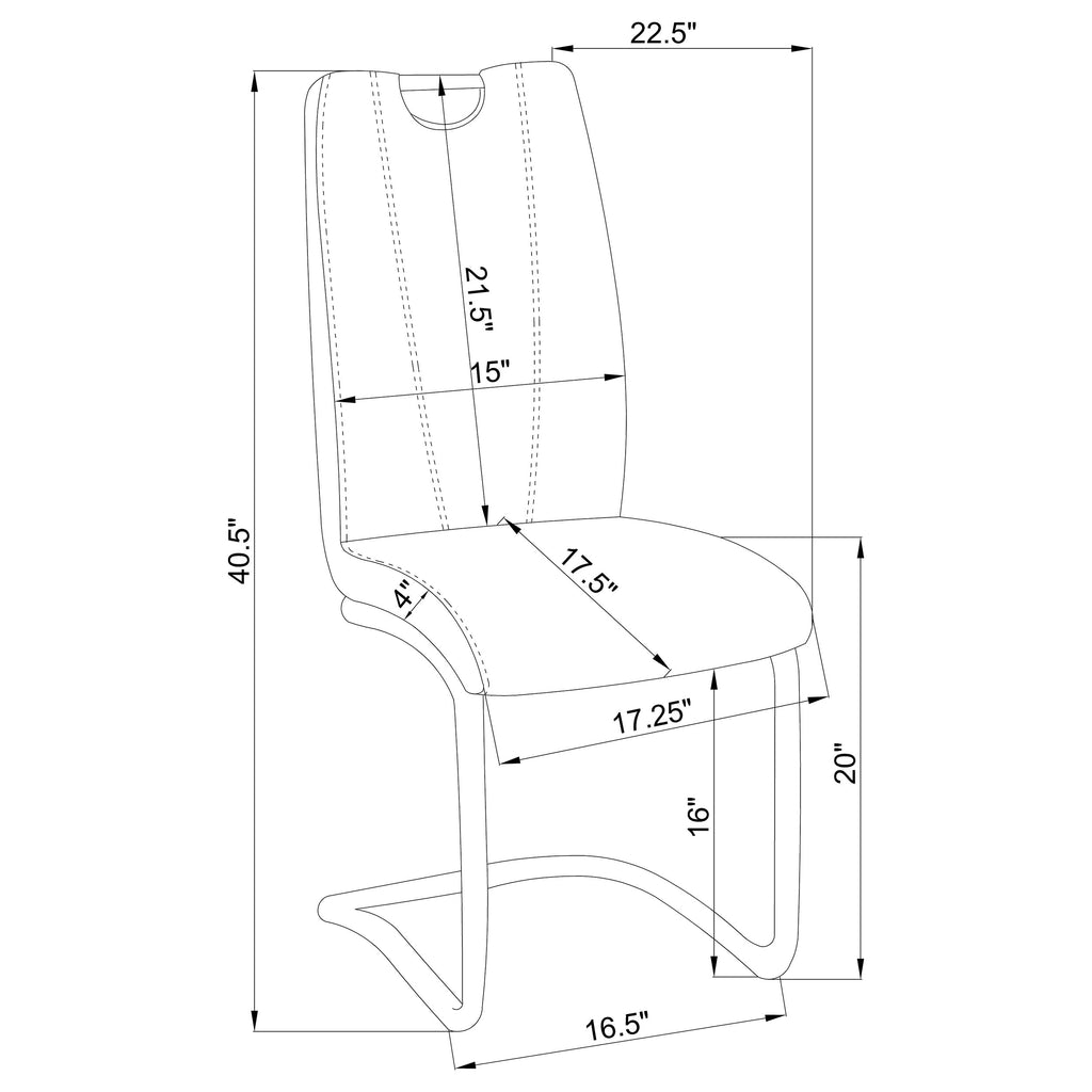 Give your entertainment area an ultra-modern feel with this five-piece dining table set. A spacious rectangular table with a gleaming high gloss white finish is supported by three stainless steel supports in a lustrous chrome finish that rest on a flush base that mirrors the top. With a pedestal-like design, the dining table invites each of the four cantilever style dining chairs to slide up for meals and conversations. Sit back and rest in the upholstered seats, wrapped in a two-tone gray and white leatherette that accents the contoured shapes. Mounted on a polished chrome metal base, the cantilever design chairs also offer an open, airy feel that showcases the table.