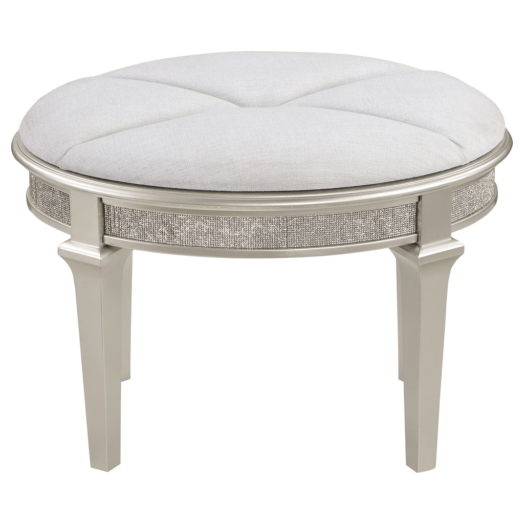 Elevate your beauty routine with the Evangeline vanity set, a trio of elegance featuring a desk with ample storage and built-in charging ports, a tri-fold mirror for perfect angles, and a chic stool with a plush seat. Each piece showcases a soft silver finish adorned with glittering trim and crystal-style knobs. The desk's felt-lined drawers protect your essentials, while the adjustable side mirrors of the tri-fold ensure precision in your beauty tasks. The stool's ivory chenille upholstery offers comfort and tucks away neatly to save space. This set blends glamour with functionality, making it an essential addition to any sophisticated dressing area.