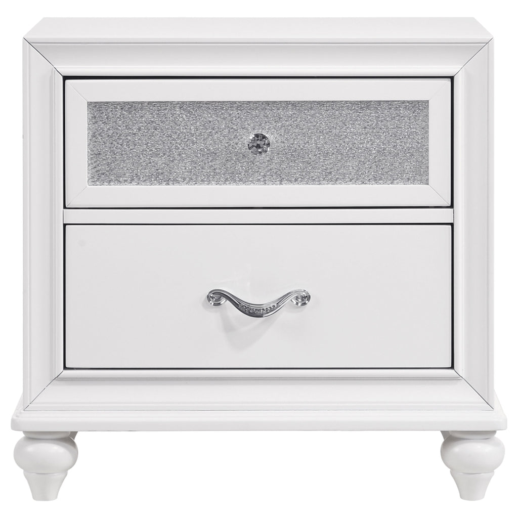Exceptionally designed for transitional bedrooms, this five-piece bedroom set includes a panel bed frame, single two-drawer nightstand, five-drawer chest, and seven-drawer dresser with mirror, all in a crisp white finish with shiny metal hardware with faceted crystal accents. The paneled headboard and footboard offer channel tufted paneling wrapped in a metallic leatherette upholstery. Other extra touches include frame molding, turned feet, and felt lined top drawers. The nightstand offers a convenient power outlet for charging devices before bed. Place this bedroom set in a home to lend a more glamorous vibe.