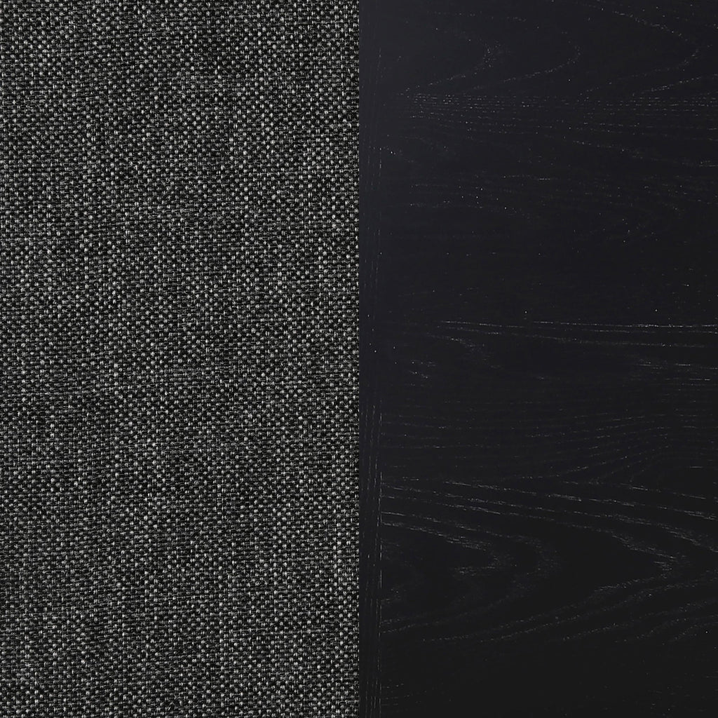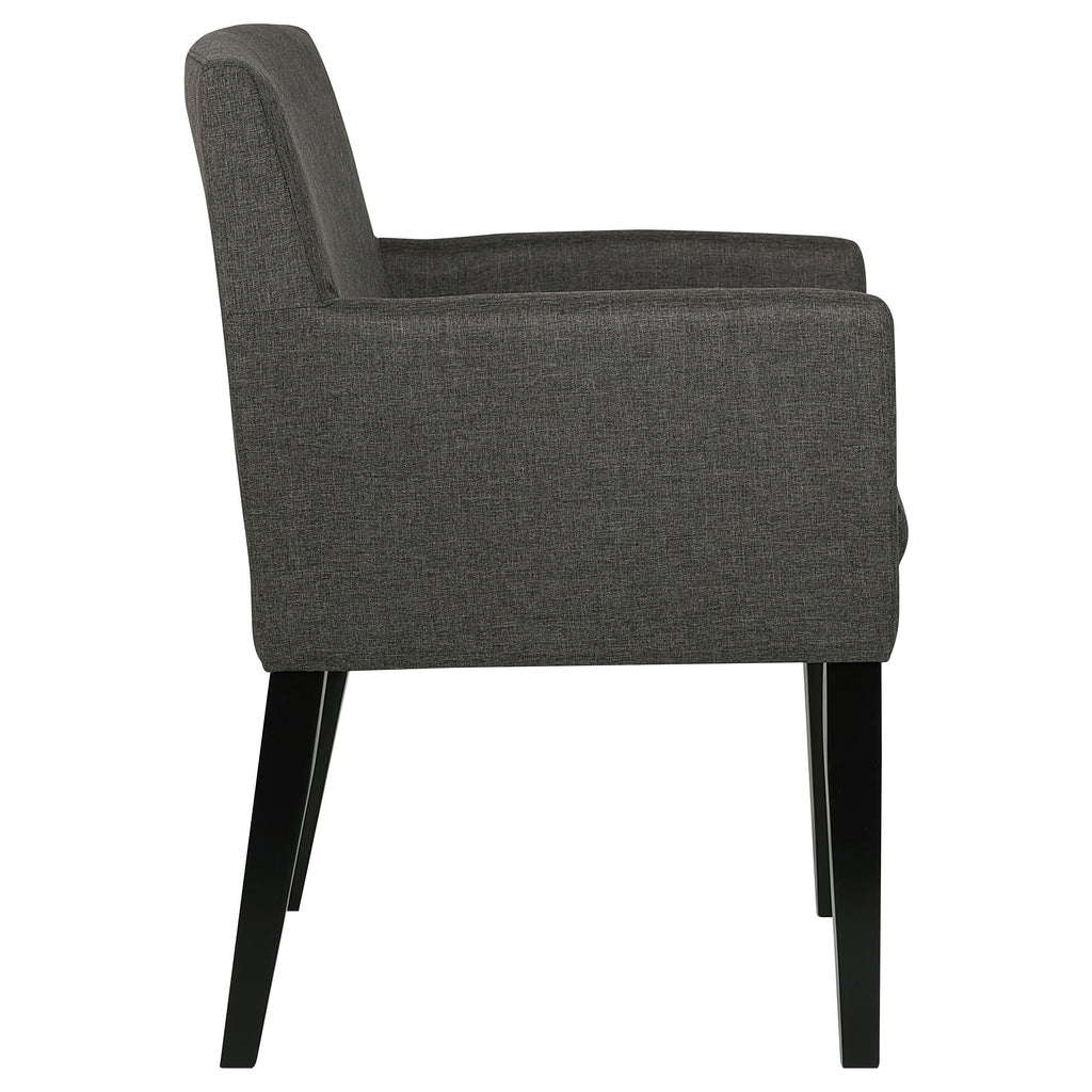 Introducing a beautiful dining room collection with clean, modern lines. The dining table boasts a oak veneer top with a black finish and a stunning tambour base design featuring fluted patterns on the double pedestal legs. The mid-century-inspired dining chairs have cushioned arms wrapped in durable charcoal grey fabric, offering comfort and style for any casual dining room.