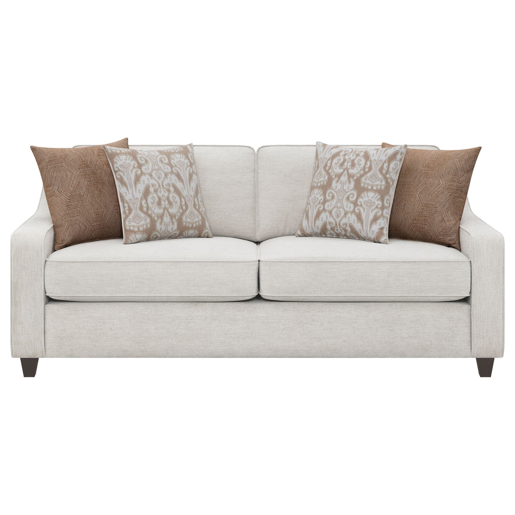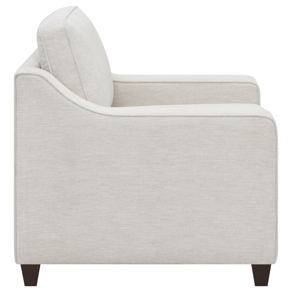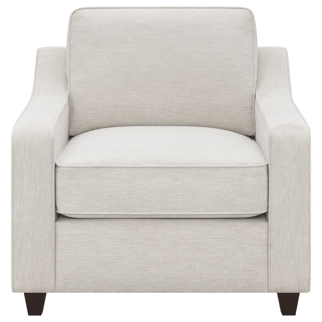 Wrapped in a cheerful, beige woven chenille upholstery, this seating set exudes a look of sophistication. Sloped track arms add elegant lines while tapered dark brown legs add a striking contrast. Understated yet regal, this transitional seating set works inside farmhouse and contemporary style homes effortlessly. Dense and plush boxed seat and back cushions feature classic welt details, as coral and copper tone accent pillows lend a boho-like tough. Add this upholstered furniture set into a space for a subtle chic aesthetic.