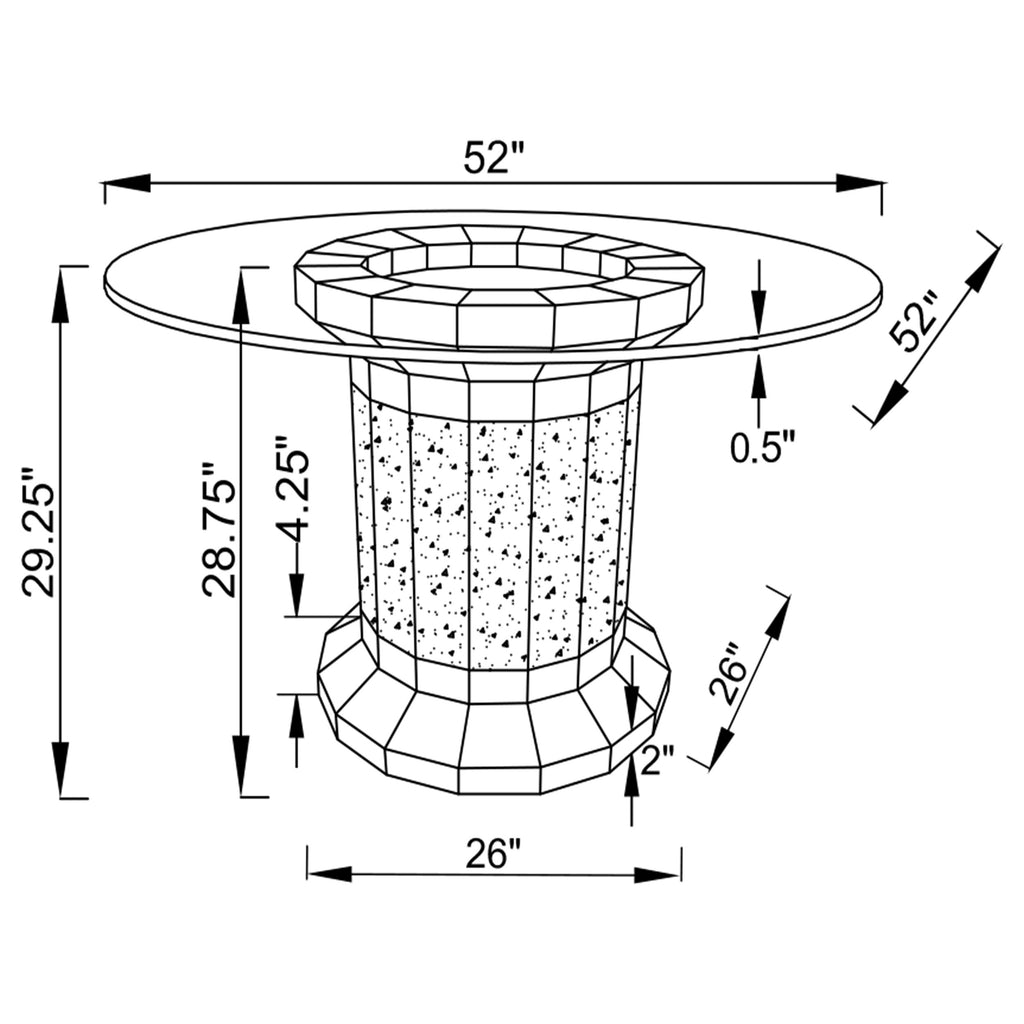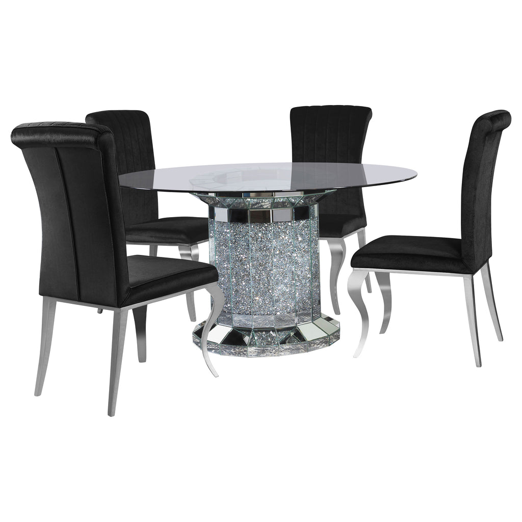 Invite over a few guests to celebrate at this modern glam dining table. A round, clear glass top reveals the scintillating column-inspired pedestal frame beneath, offering an open and airy look. Sparkling faux diamonds are encrusted within the base for a luxe touch. Defining the flush bottom base and the top is a gleaming mirror tile trim that reflects its surroundings effortlessly. Slide up each of the four velvet upholstered side chairs and enjoy a restful dining experience with their tall backrests and rolled tops.
