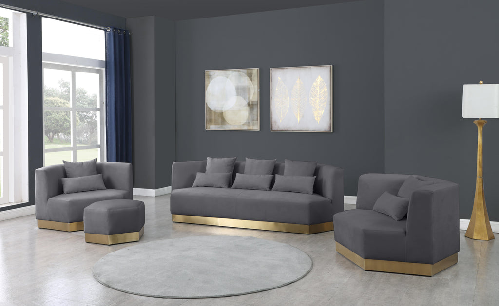 Revamp your living room, den or great room with this Marquis velvet sofa. This handsome piece features a bold contemporary look that���s well at home in most modern d?�cor themes. Plump pillows add a little something extra to make you feel extra cozy. Upholstered in soft grey velvet, this piece fits in nicely with nearly any other colors in the room, and the brushed gold stainless steel base ensures its up-to-the-minute look.