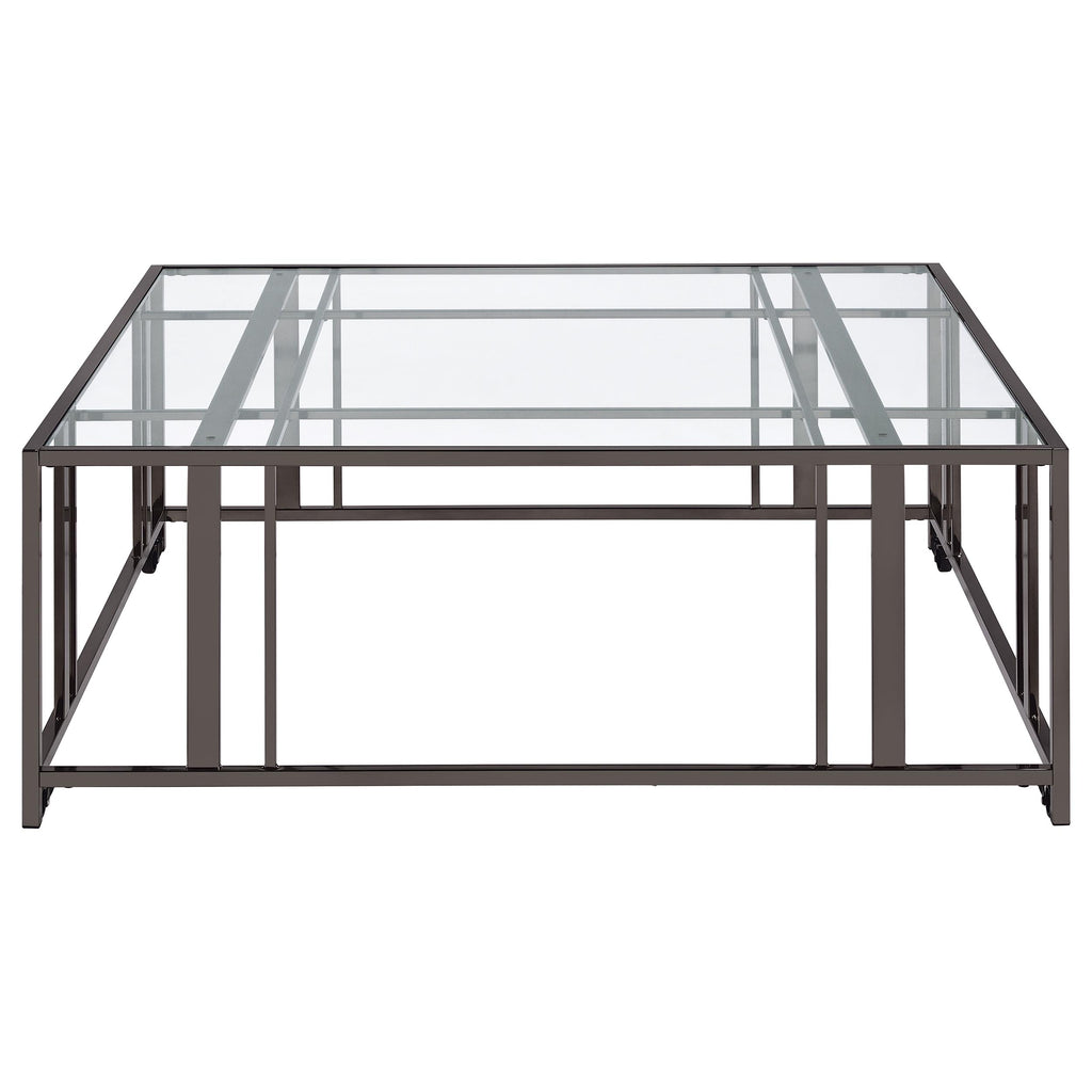 This square coffee table combines functionality with modern style, featuring a tempered glass top and a sturdy geometric base made from heavy-gauge metal. The open-frame design creates a sleek, contemporary look, while smooth-rolling casters add mobility for easy repositioning. Its scratch-resistant materials ensure durability and low maintenance, making it a versatile centerpiece for any living room or shared space.
