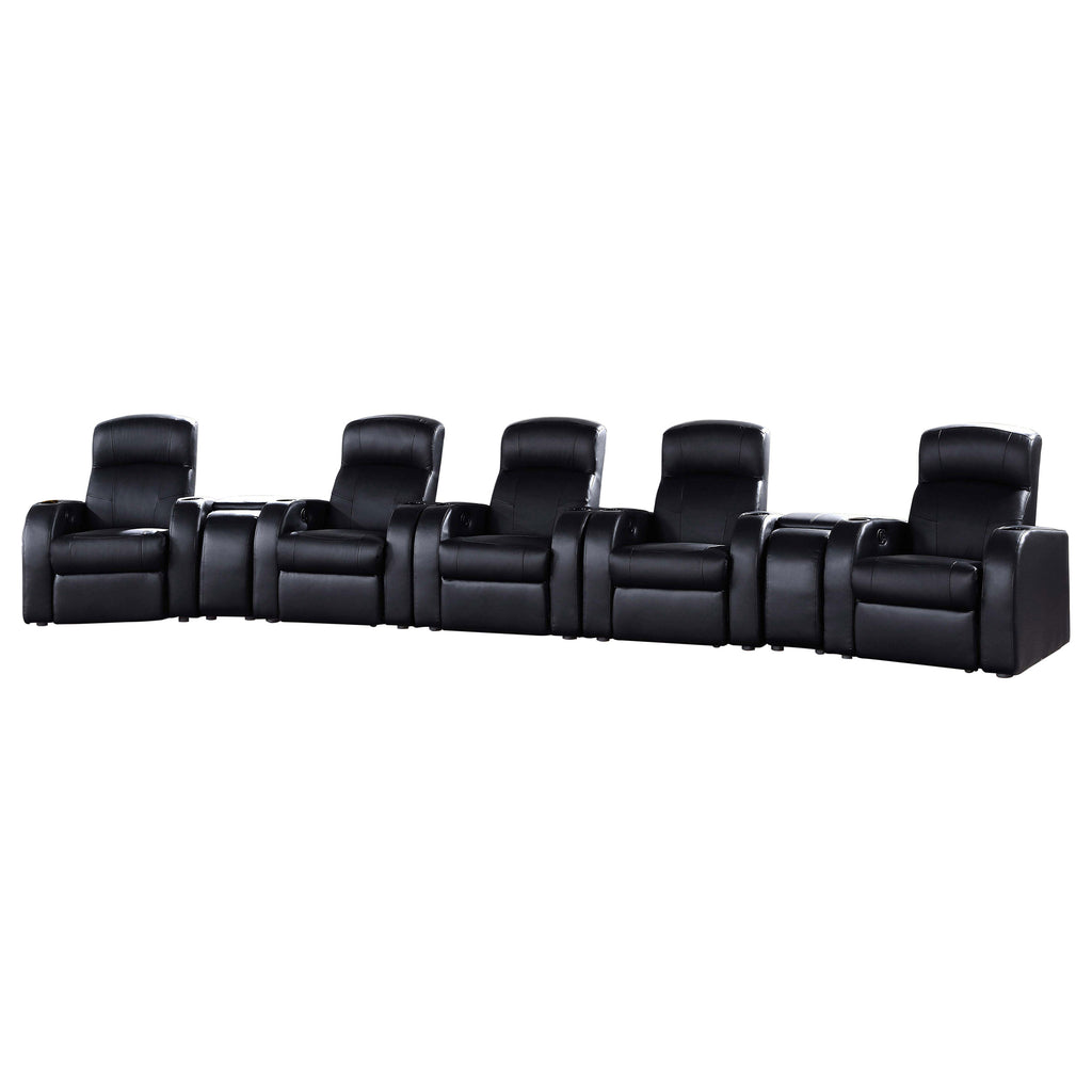 Get the movie theater experience at home with this set of recliners. Customize your home theater with your choice of seating configuration, available in numerous options. Optional center consoles offer unique storage for remotes and small items. Each top grain leather recliner is designed with its own cup holder for your favorite beverage. These black recliners are bound to improve your home theater experience and comfort levels.