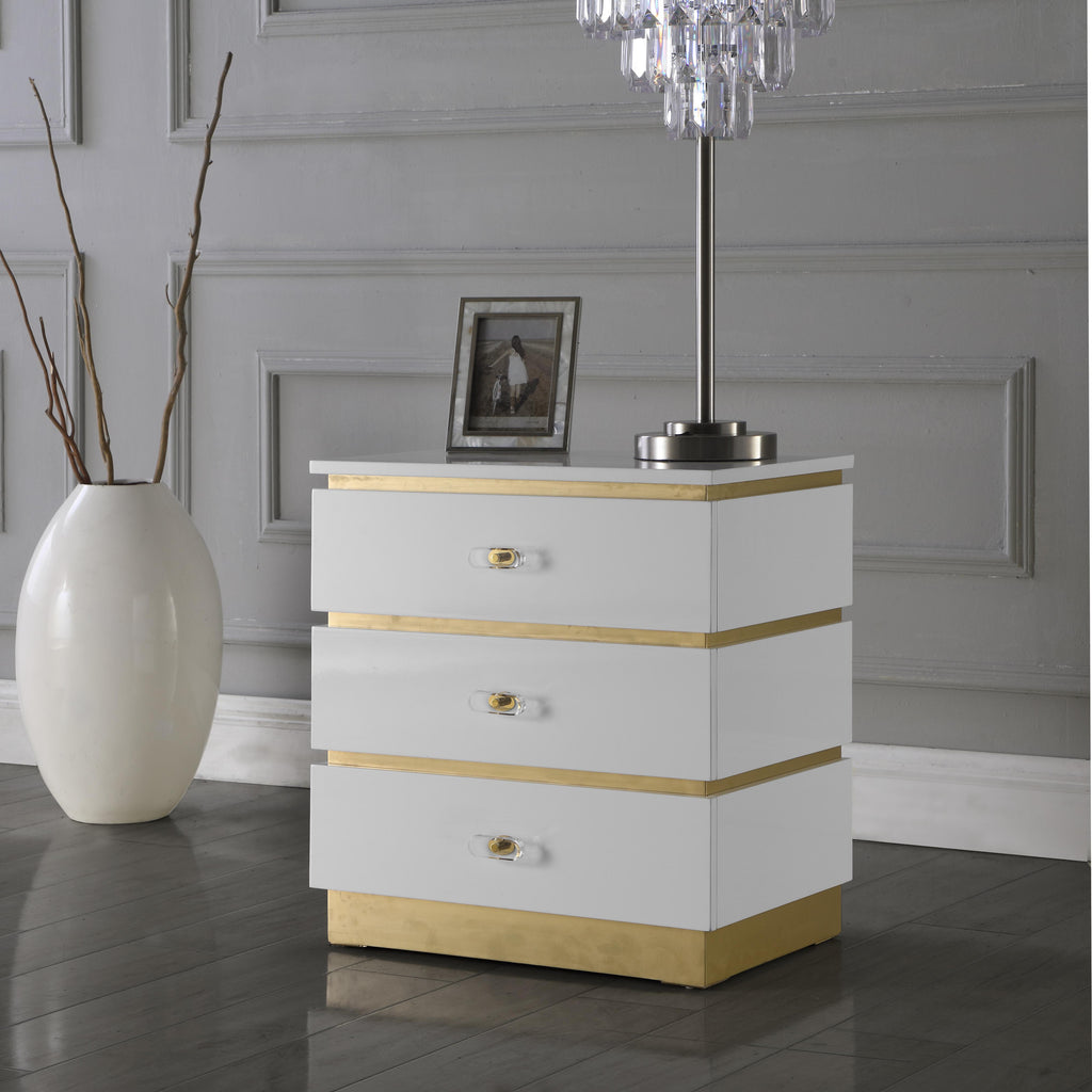 Go for an upscale, regal look in your room with this Esme Side Table. A sleek white lacquer finish adds a distinctive modern touch, and gold-finished trim on the painted wood base lends sophistication, style, and elegance to this handsome table. Three drawers offer roomy interiors for storing everything from bedside essentials to reading material, and a large top is sufficiently sized to accommodate a lamp, alarm clock, and other items. Use this Esme Side Table as a nightstand in the bedroom, or ring it into the living room as an end table for needed storage.
