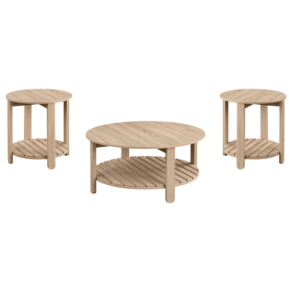 This coffee table set combines modern farmhouse style with functional design, creating a cohesive look for any living room. Each piece is crafted from durable engineered wood with an eco-friendly, scratch-resistant laminate veneer and features a natural finish with soft wood grain detailing. The round tabletops provide ample surface space, while the slatted lower shelves add texture and storage options. Designed for everyday use, this set is a practical and stylish choice for any home.