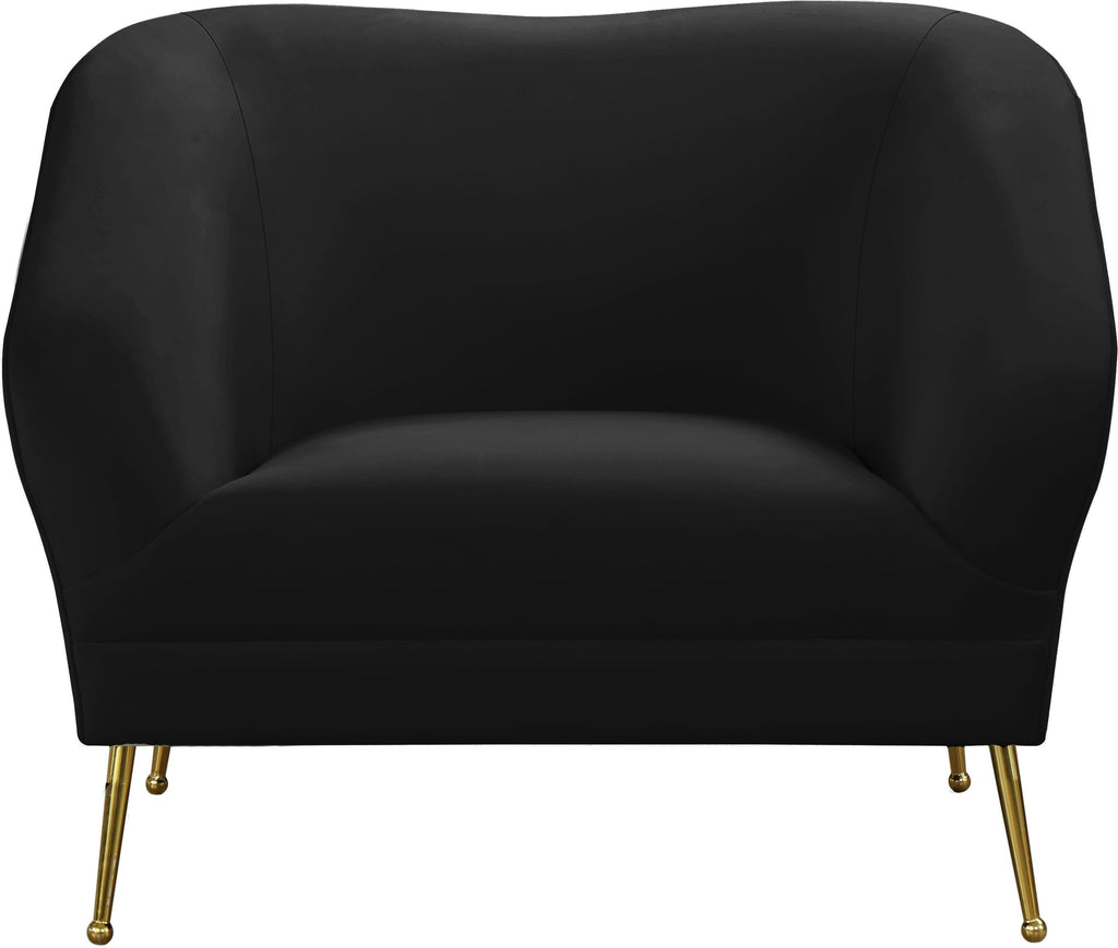 Create instant drama in your room with this Hermosa Velvet Chair by Meridian Furniture. The mid-century design makes the chair a true standout among other furnishings, with its sleek curved back and arms that create an aesthetically pleasing silhouette. The soft black velvet upholstery feels sleek and sumptuous to the skin and gives your room an upscale look. Gold legs finish off the design, each of them with a ball design on the foot for added sophistication.