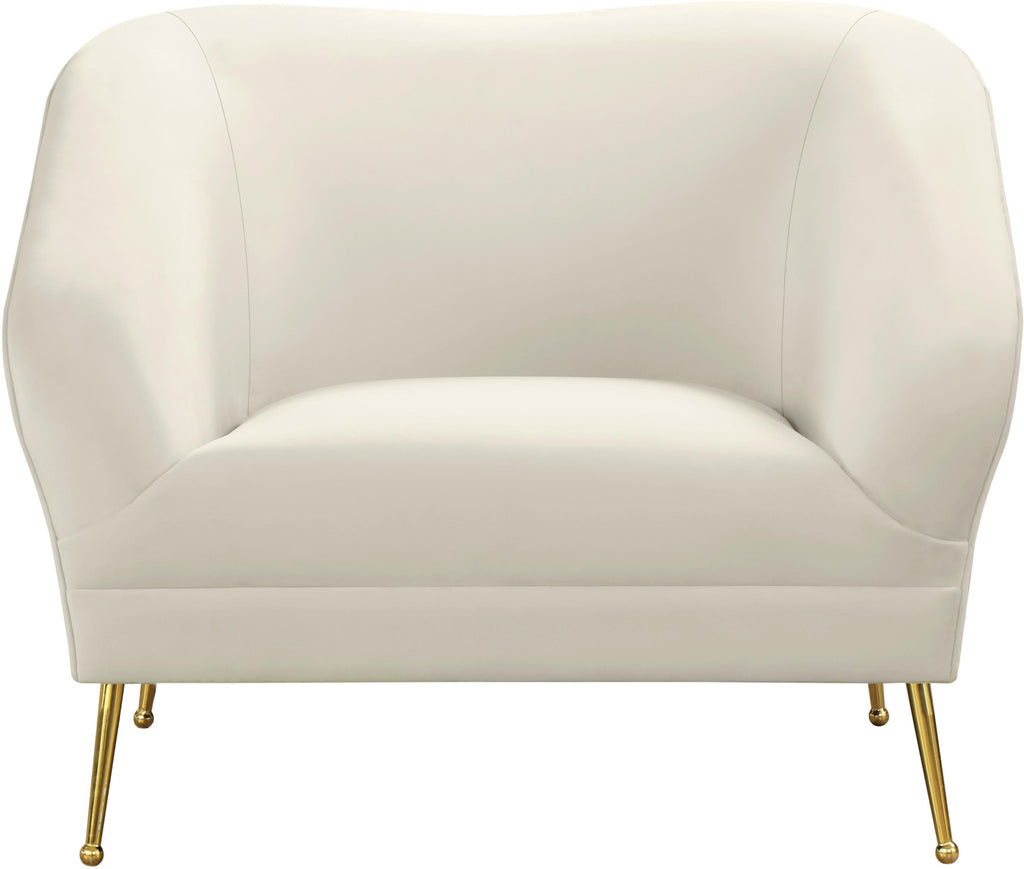 Create instant drama in your room with this Hermosa Velvet Chair by Meridian Furniture. The mid-century design makes the chair a true standout among other furnishings, with its sleek curved back and arms that create an aesthetically pleasing silhouette. The soft cream velvet upholstery feels sleek and sumptuous to the skin and gives your room an upscale look. Gold legs finish off the design, each of them with a ball design on the foot for added sophistication.