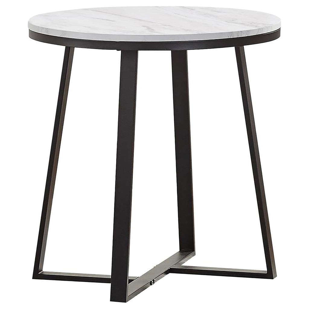 This coffee table set offers a stylish two-tone design that enhances modern living rooms with ease. Featuring round tabletops crafted from white faux marble and subtle grey veining, these tables exude elegance. The intersecting U-shaped legs in matte black powder-coated metal form a striking geometric silhouette. Constructed with engineered wood, PVC laminate, and heavy-gauge metal, the set ensures both durability and contemporary appeal. Ideal as a cohesive centerpiece for any living space.