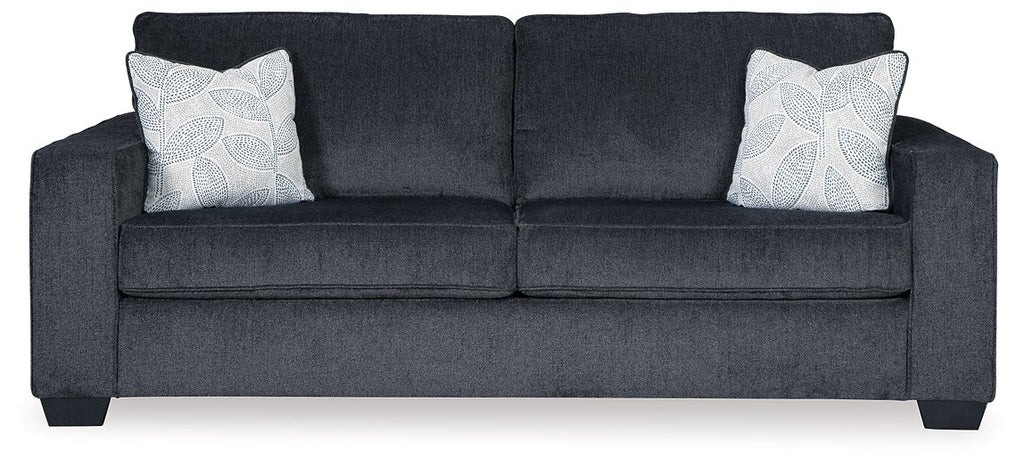 If style is the question, then this sofa is the answer. Sporting clean lines and sleek track arms, the decidedly contemporary profile is enhanced with plump cushioning and a chenille-feel upholstery that's so pleasing to the touch. Sure to play well with so many color schemes, this sofa in slate gray includes a pair of understated floral pattern pillows for fashionably fresh appeal.More About This Product