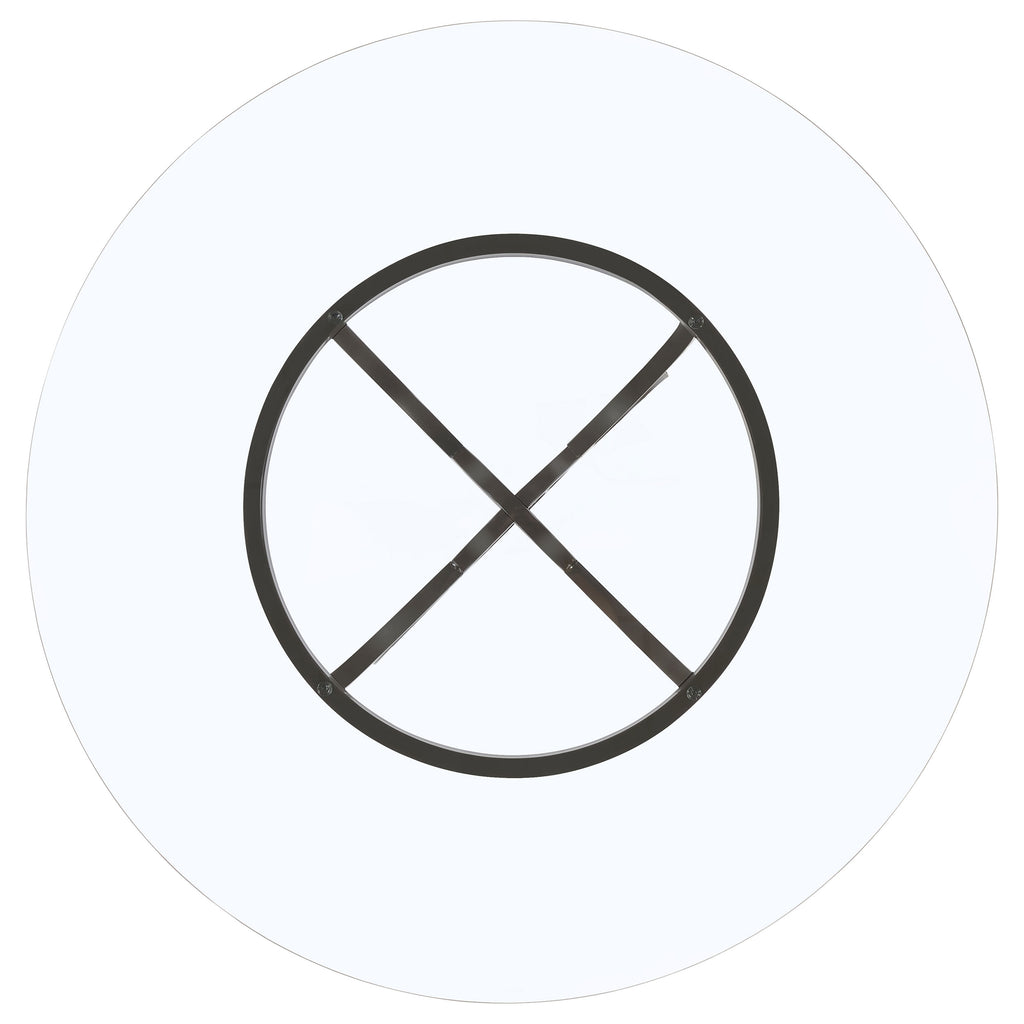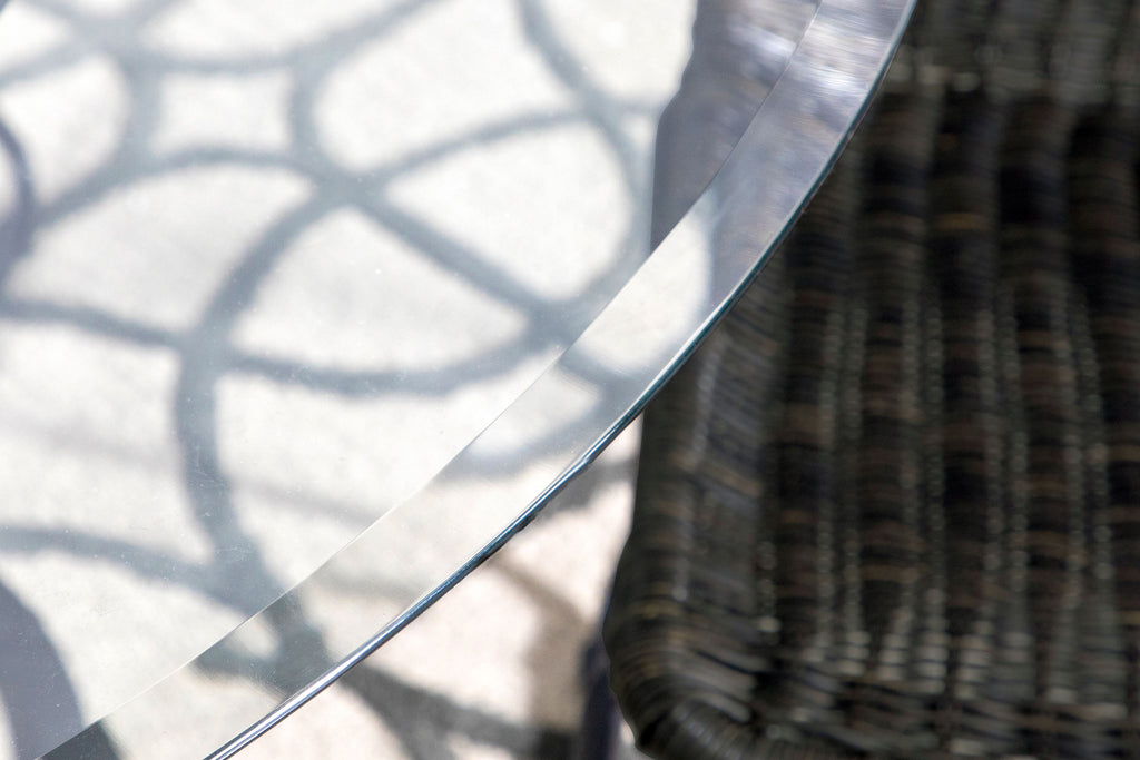 Aviano presents a contemporary dining masterpiece that's truly captivating. The meticulously crafted metal table base boasts four curvaceous legs converging around an interlocking ring waist, adorned with a surprising gunmetal finish. Crowned with a 6mm 48" diameter clear tempered glass, it seamlessly blends grace and modernity. Discover the allure of the transitional glass dining table, exuding casual charm. Its clear glass round elegantly rests on a captivating base with four stylized M legs, artistically interlocked in a ring motif and adorned with a rich gunmetal finish. At 30 inches, it's the perfect addition for a chic breakfast nook or a stylish eat-in kitchen, infusing a touch of timeless elegance.