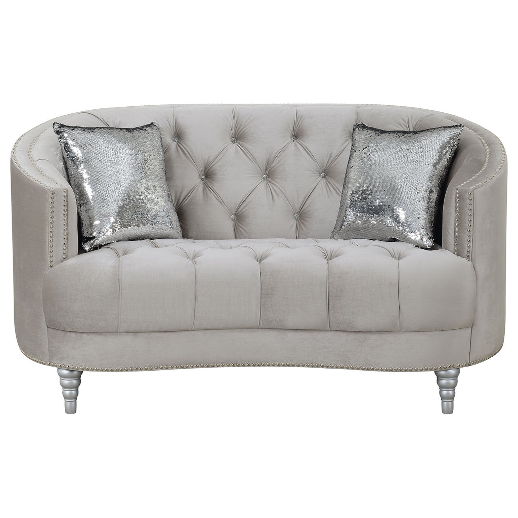 Classic and elegant, this two-piece living room set looks great with a chic aesthetic. Featuring high rolled and arms and button tufting, the traditional silhouettes of the sofa and loveseat emit an elegant aura. Perfect for a classic motif, the grey fabric upholstery adds texture to any space. A decorative nail head trim lines the cushions and subtle crystal details give this stunning piece all-over glam. Dress up any space with the smooth features and neutral hues.