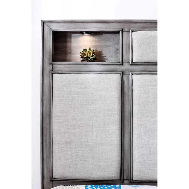 DAPHNE Gray Cal.King Bed, 91 3/4"L X 81 1/4"W X 58"H, 154.28lbs. In addition to stunning carved details and felt-lined top drawers, this transitional style bedroom collection comes with built-in headboard shelves and convenient touch lights. An extra drawer hides within the nightstand and dresser while the chest o ffers extra functionality with its lift-top jewelry storage, complete with mirror. Sleek silver tone handles sparkle against the weathered gray finish for a beautifully contemporary design that will beautify any bedroom. Features: Transitional Style Padded Fabric Headboard Built-in Touch Light in Headboard Hidden Drawer in Night Stand and Dresser Double Drawer Fronts Felt-lined Top Drawers Solid Wood, Wood Veneer, Others Gray Finish