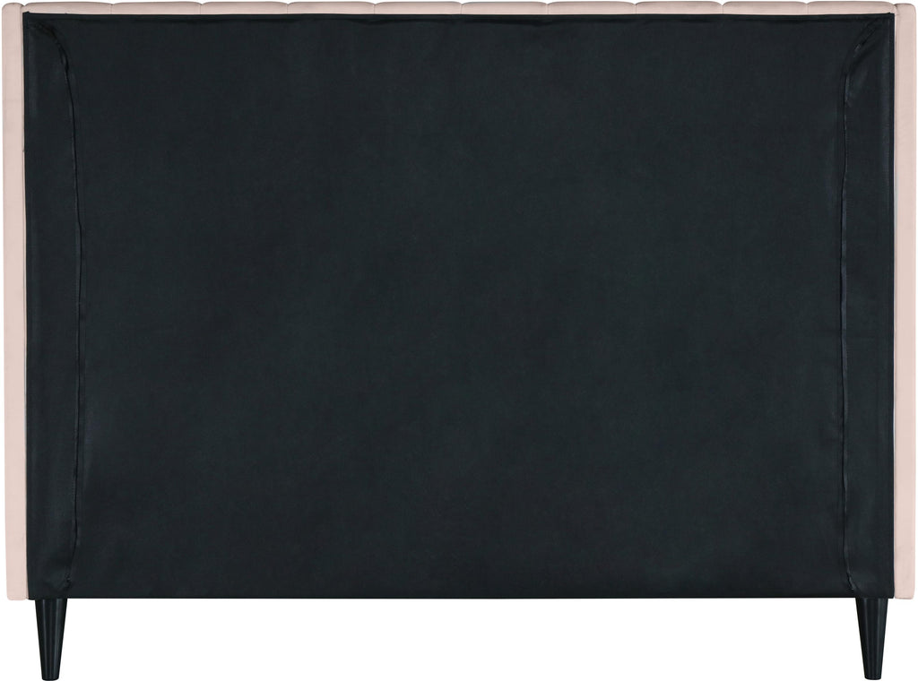 Snuggle up to a pet or other loved one in this richly upholstered Eva pink velvet full size bed for the ultimate in rest and relaxation. The wing back headboard has cushioned vertical deep channel tufting, and both the side rails and footboard are upholstered too for your comfort. Tapered black wood legs match the upholstery and support this contemporary bed, elevating it sufficiently that you can store items underneath.