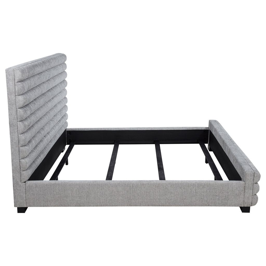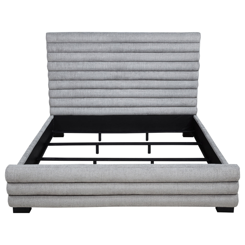 Elevate your bedroom with this modern bed featuring a striking 58-inch tall channel-tufted headboard and matching footboard. Upholstered in soft grey boucle fabric, its textured design creates a cozy and inviting ambiance. Built with durable birch, plywood, and engineered wood, this bed ensures long-lasting support. Foam padding enhances comfort, while black-finished legs provide stability and subtle contrast, making it a perfect statement piece for contemporary spaces.
