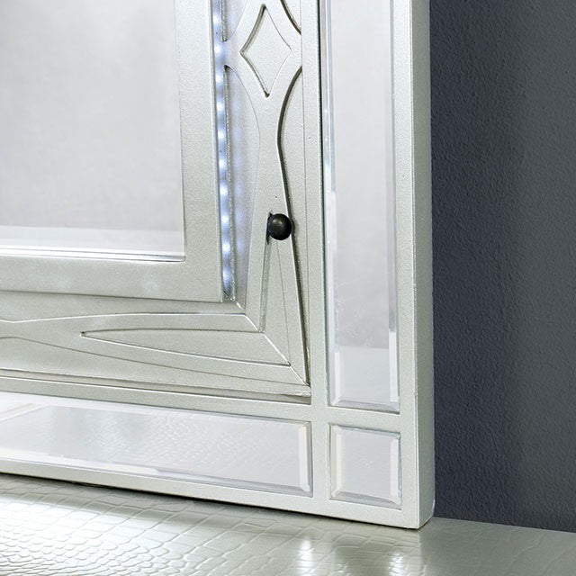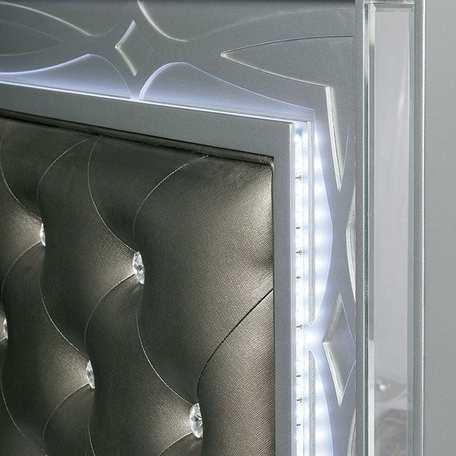 The glamor is in the details of this bedroom set from the Manar Collection. The headboard is upholstered in a faux leatherette, button-tufted with crystal-acrylic buttons, and embedded with a LED light, creating a sparkling aesthetic. The matching pieces feature a decorative, circular pattern, only adding to opulence of the design. Your bedroom will be a place to pamper yourself with this set.