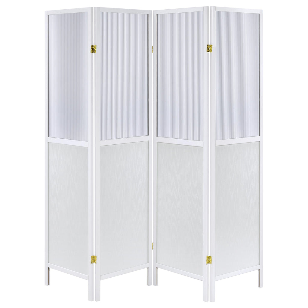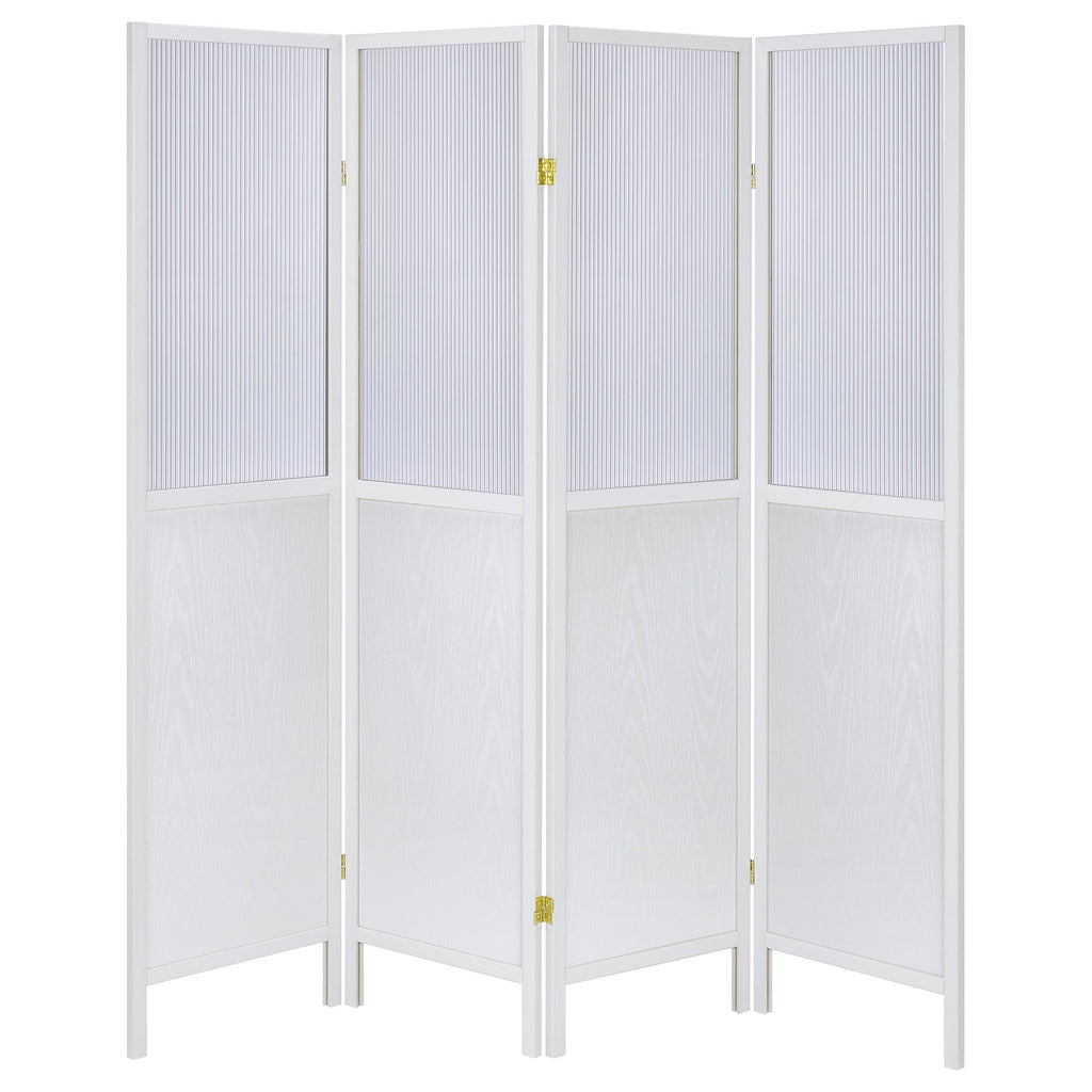 Create the perfect sense of division in your open living space with a transitional four-panel room divider. The freestanding piece offers four tall panels, each divided with a semi-opaque top section that allows light to pass through. The panels are ideal for a large master bedroom, creating a sense of privacy for dressing or to section off a desk. The frame of each panel features a neutral finish and a solid lower panel for excellent performance and privacy. The lower panels includes a wood grain finish that's subtle, offering a touch of dimension to any room.