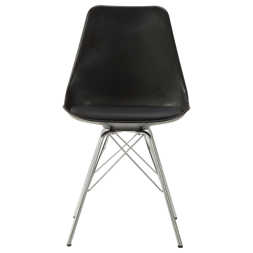 In a room bathed in soft, natural light, the contemporary dining table stands as an ode to minimalist elegance, its round silhouette offering a canvas for intimate gatherings. The pedestal-style base, a nod to mid-century design, rises from the floor in a smooth, powder-coated embrace, anchoring the space with a whisper of nostalgia. Accompanied by four chairs that marry the iconic Eiffel design with modern sensibilities, their sleek black shells cradle a cushion of comfort, while the dazzle of chrome legs catches the eye and reflects the room's airy ambiance. This dining set, effortlessly sophisticated, is as suited for a lively game of cards as it is for a tranquil morning, coffee cup in hand.