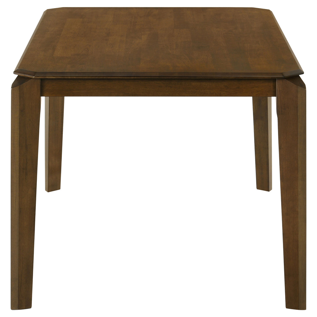Center your stylish dining room on the angular silhouette of a modern rectangular dining table. Perfect for family gatherings and daily meals, it boasts a dark brown wood finish over Asian hardwood, delivering excellent style and durability. The rectangular table featured a chamfered edge that augments the flared design and almost faceted look of its four support legs. The legs protrude beyond the tabletop, while a recessed apron completes the look with familiarity. The table comfortably seats four to six, perfect for your breakfast nook or dining room.