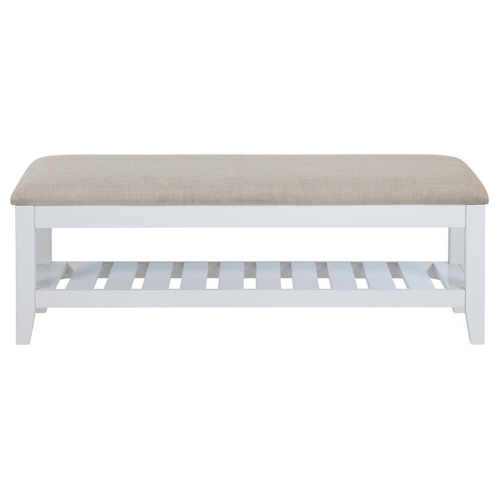 This sleek and versatile bench brings a touch of timeless elegance to any room. Its beige upholstered, foam-padded seat offers exceptional comfort while the sturdy wooden frame, finished in white, ensures long-lasting durability. A slatted shelf beneath the seat provides practical storage for shoes or other essentials, making it perfect for entryways or bedrooms. The clean lines and simple design make it a fitting addition to both modern and classic interiors. Its thoughtful construction delivers both functionality and an understated, stylish charm.