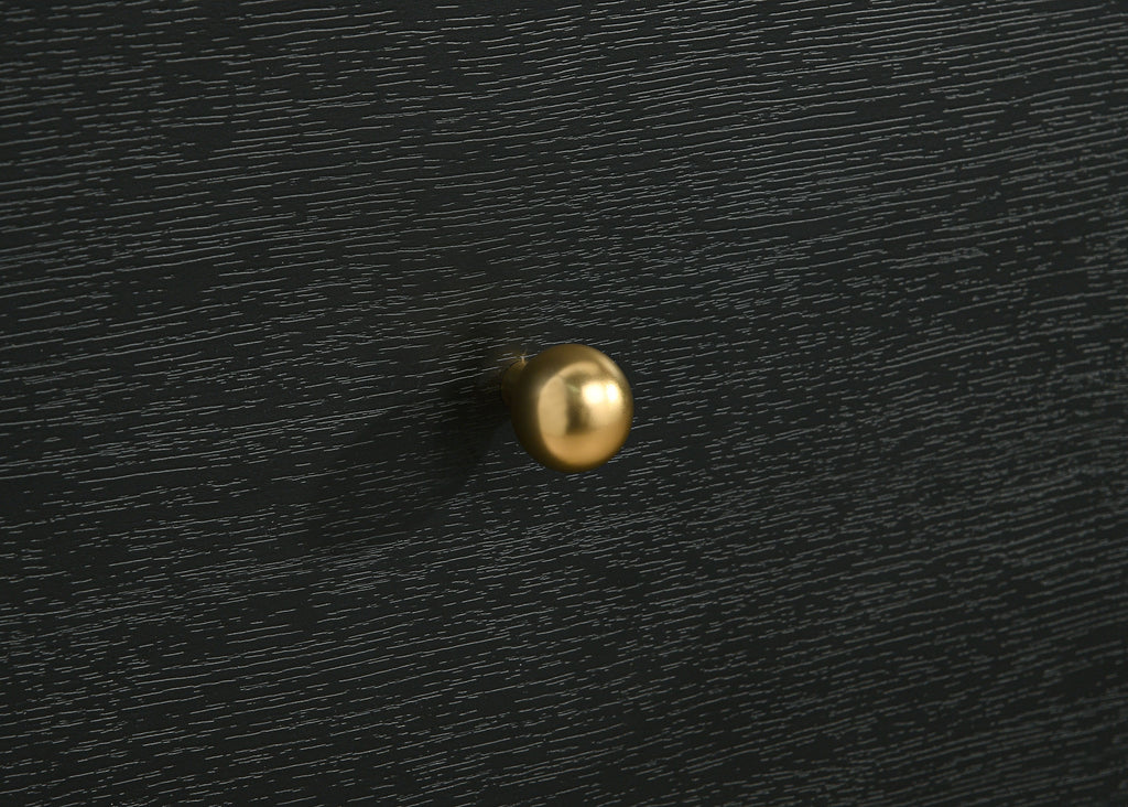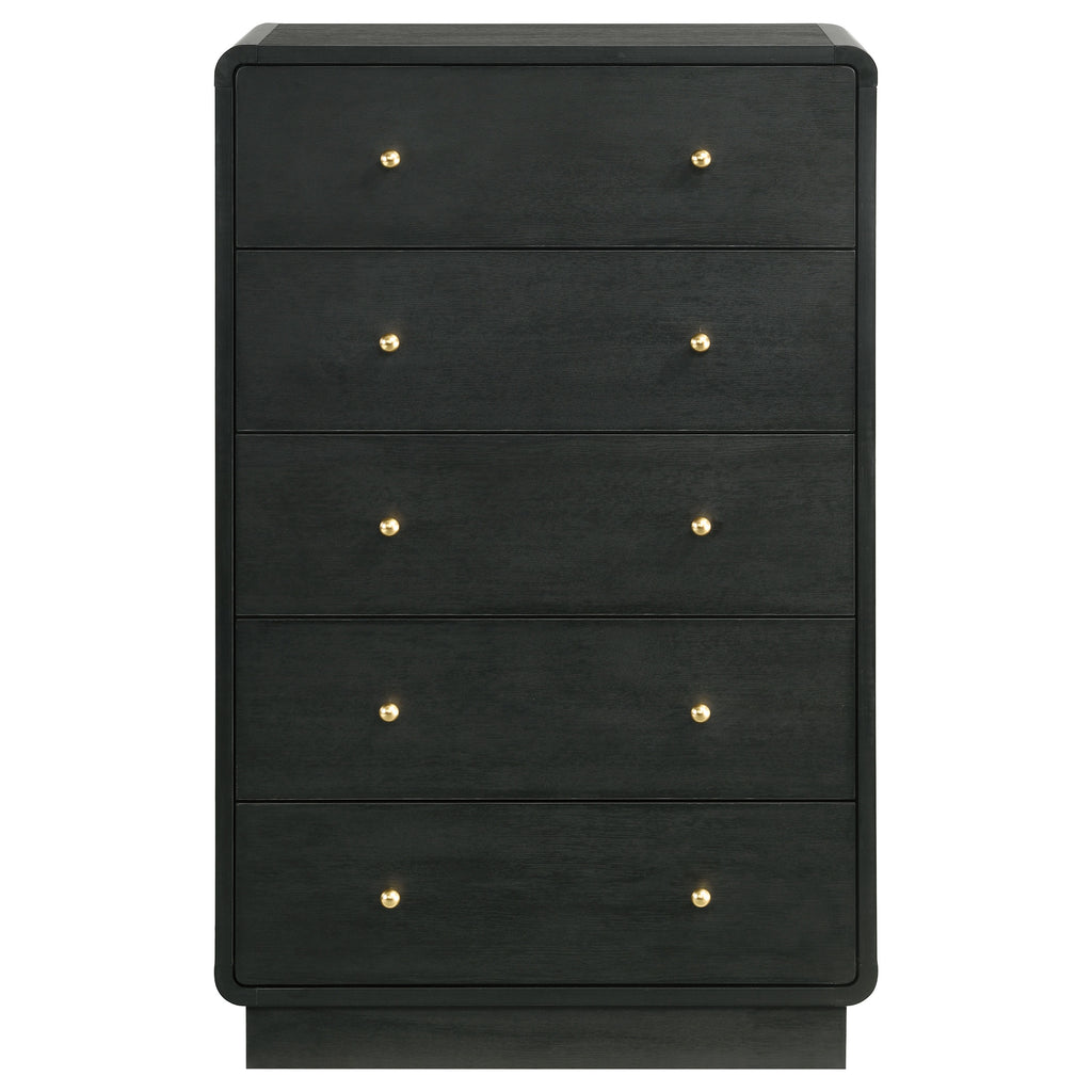 Create a dedicated space for clothing and accessory storage with this modern five-drawer chest. Its sophisticated presentation is complemented with a black finish over durable melamine surfaces, resisting damage to maintain its fresh, clean aesthetics. Each drawer front is dotted with a pair of ball knobs, offering seamless performance and a refined, glam touch of character. The chest features a rounded silhouette, softening the dark black finish, while adding to its modern appeal. Add art to its roomy top to create a truly eye-catching accent piece in your bedroom.