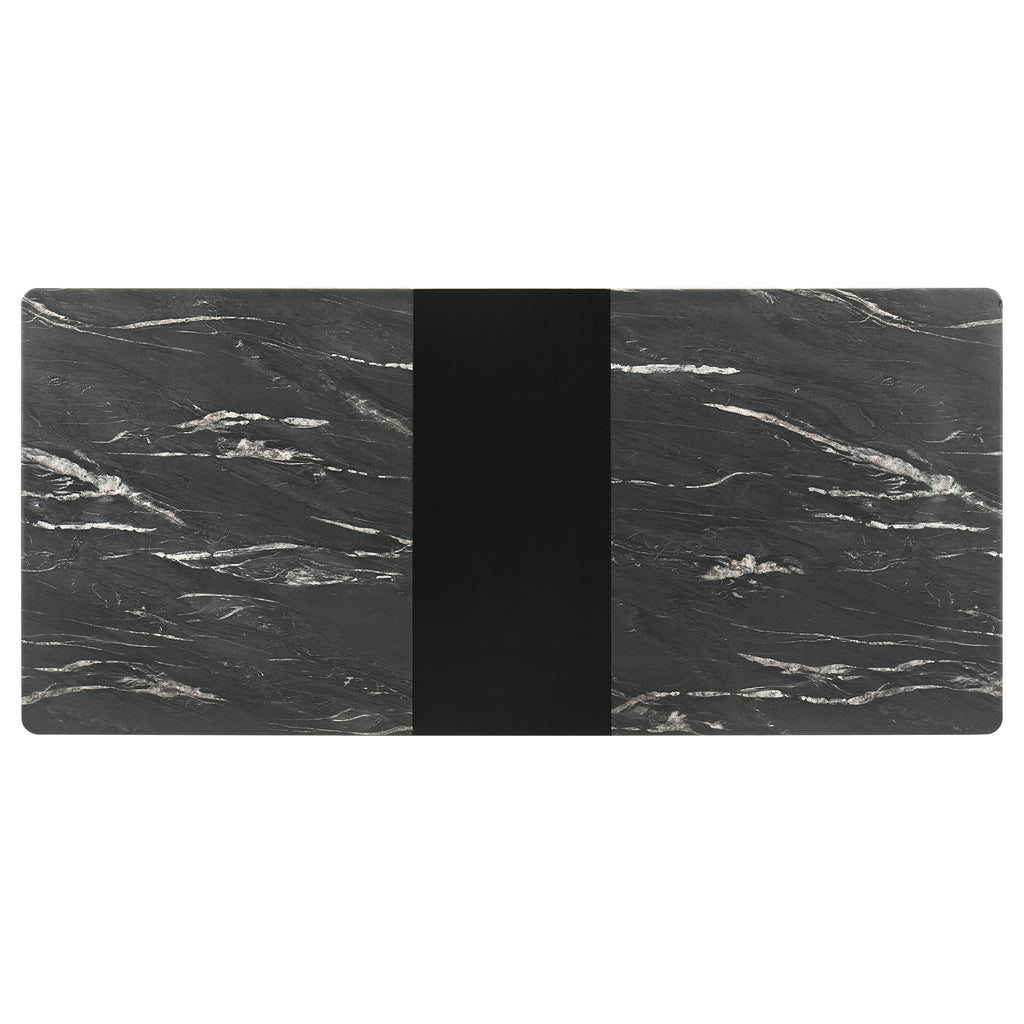 The luxurious look of faux marble creates a glam sensibility for a modern dining table. The black marble look of the tabletop complements a sleek base with fin-style legs and a recessed apron. The table includes a self-storing leaf for easy expansion to accommodate guests or the family. Its black base finish is crisp and classic, offering timeless elegance that never goes out of style. It's the perfect way to bring fresh, modern energy to your dining room.