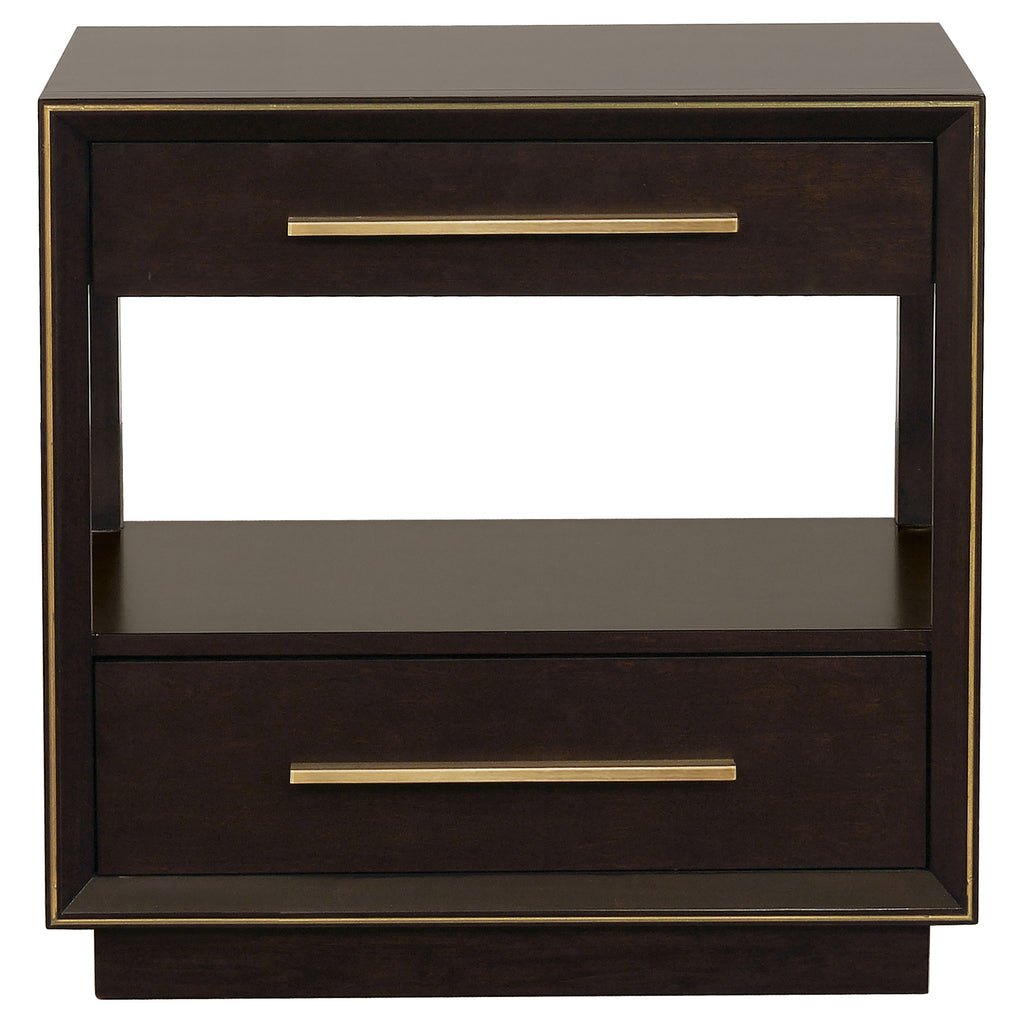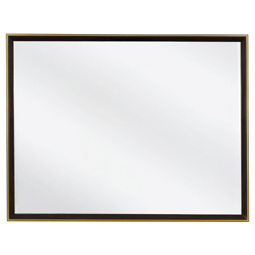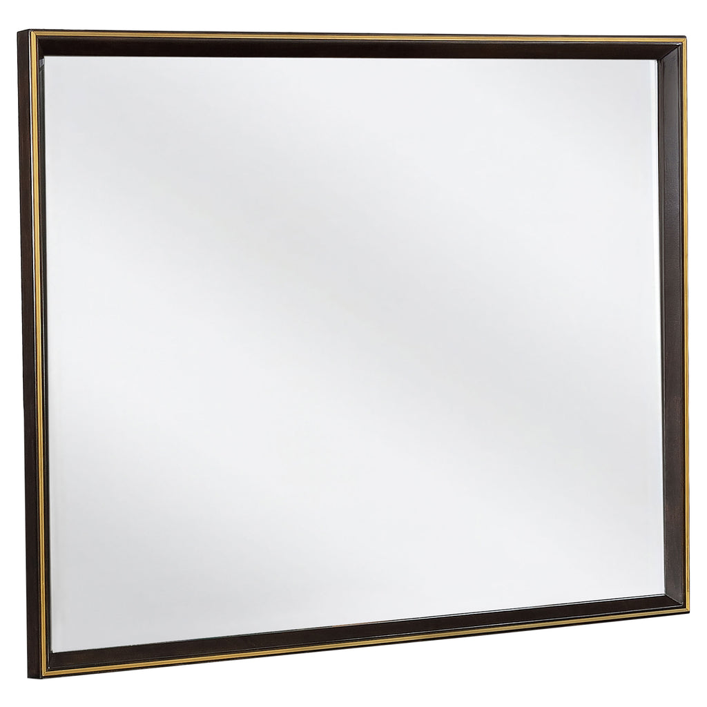 Geometric features from this California king four-piece bedroom set transform a modern setting. Warm and full of depth, the high headboard features upholstery and a smoked peppercorn finish. Complete with ample storage, this set has a nine-drawer dresser and two-dresser nightstand and included shelf. Welcome structure from the silhouette and personality from the retro inspired details. Dress up the dresser with the clean and elongated mirror.
