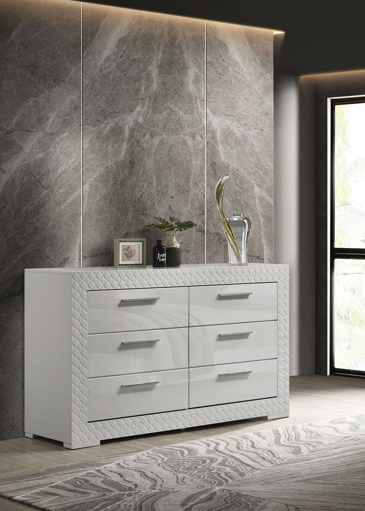 Elevate your bedroom decor with this stunning dresser, designed for both beauty and function. The high gloss finish enhances the contemporary Italian style, while the 3-dimensional diamond tile emboss adds a touch of sophistication. Six spacious drawers offer ample storage for clothing and accessories, each featuring felt lining in the top drawers to protect delicate items. The dresser is built with sturdy English dovetail joinery and 45mm thick metal glides, ensuring smooth operation and durability. This piece is perfect for those who appreciate fine craftsmanship and modern design.
