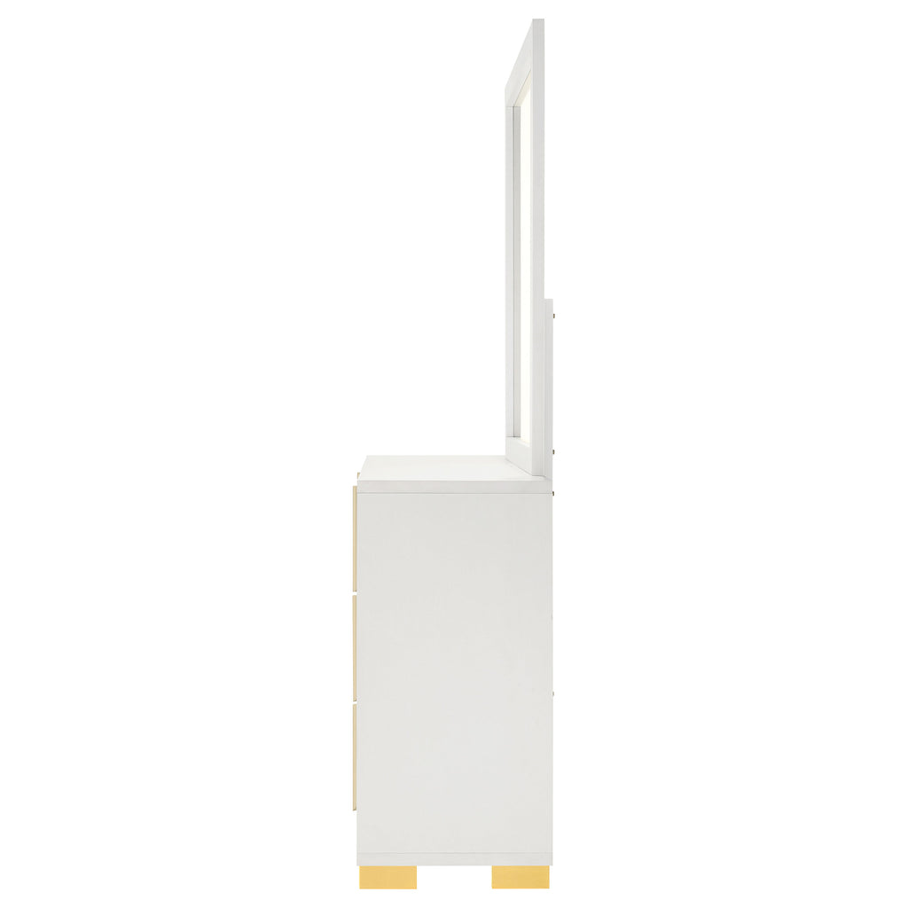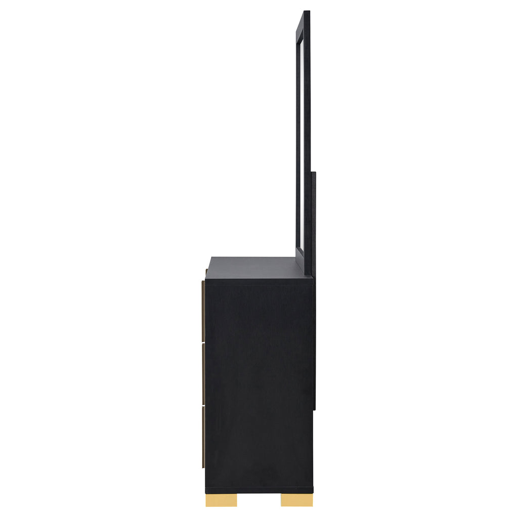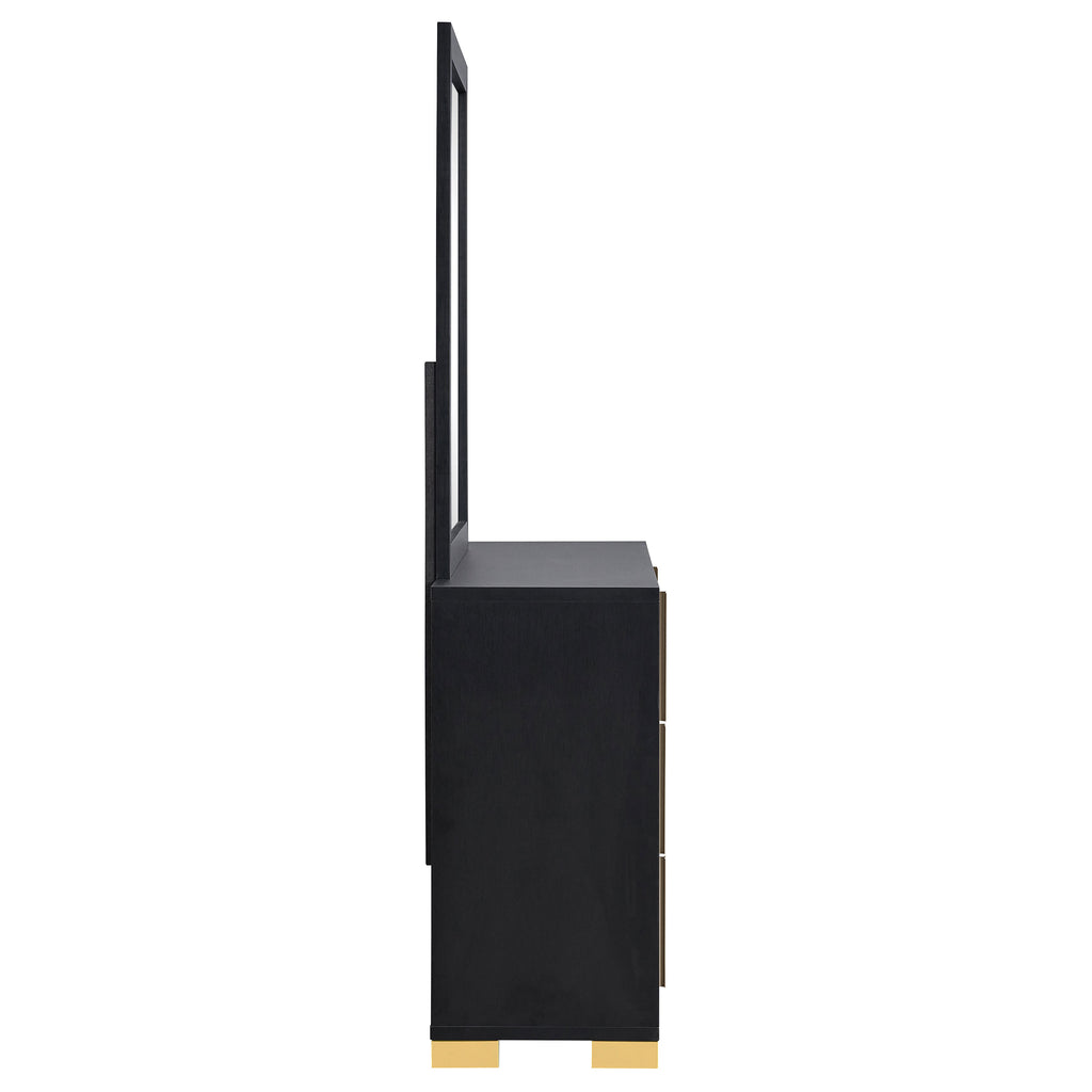 Immerse yourself in the striking elegance of the this dresser and mirror set, a true embodiment of contemporary chic with an Art Deco twist. The six-drawer dresser, crafted with wood products, showcases a captivating vertical design, with gold finish metal accents creating a mesmerizing geometric pattern. The drawers, featuring English dovetail construction, glide smoothly on center metal runners, marrying form with function. Above, the sleek, minimalist mirror, framed in engineered wood and decorative laminate, complements the dresser, its non-beveled glass amplifying the room's space and light. Together, this set offers a harmonious balance of dramatic aesthetic and practical elegance, transforming the bedroom into a modern-day sanctuary.