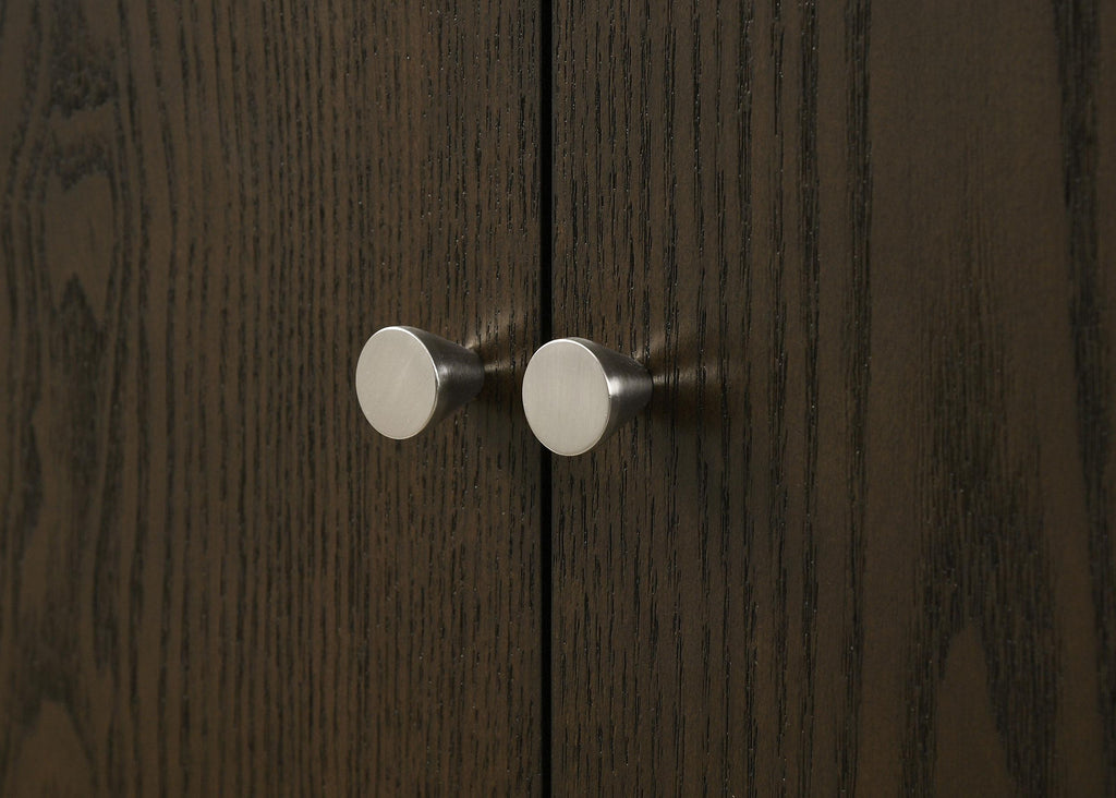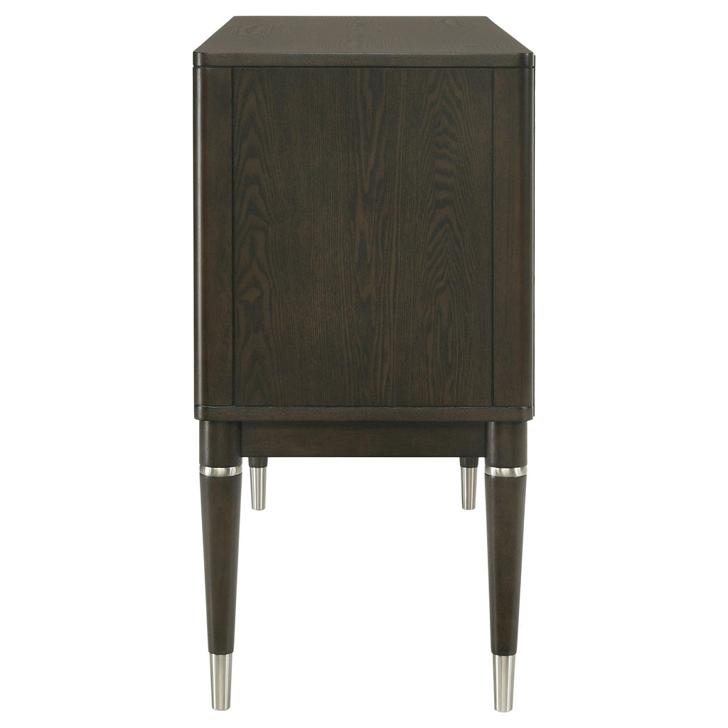 Add both style and functionality to your dining room with this elegant sideboard, finished in a sophisticated ash brown wood tone. The clean-lined design features four cabinet doors that open to reveal spacious shelving, perfect for storing tableware, linens, or other essentials. Crafted from engineered wood, Asian hardwood, and ash veneer, it ensures long-lasting durability. Sleek metal-capped tapered legs and minimalist hardware accents complete the modern aesthetic, making this sideboard a refined and practical choice for your dining area.