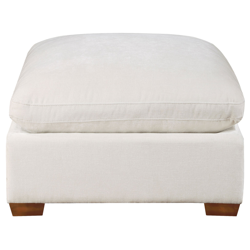 With the easy style of ultra-modern living, the ottoman delivers a streamlined motif with ultimate versatility. A classic layered design offers plush, plump aesthetics merged with a boxy, wood-constructed base. Smooth fabric upholstery covers wood framing, soft to the touch and easily incorporated into a host of distinctive or basic color palettes. Perfect for both contemporary and transitional settings, it is ideal for extra seating, serving with trays, or merely as a place for resting tired feet. Chunky, tapered wooden feet embellish this ottoman with iconic style.