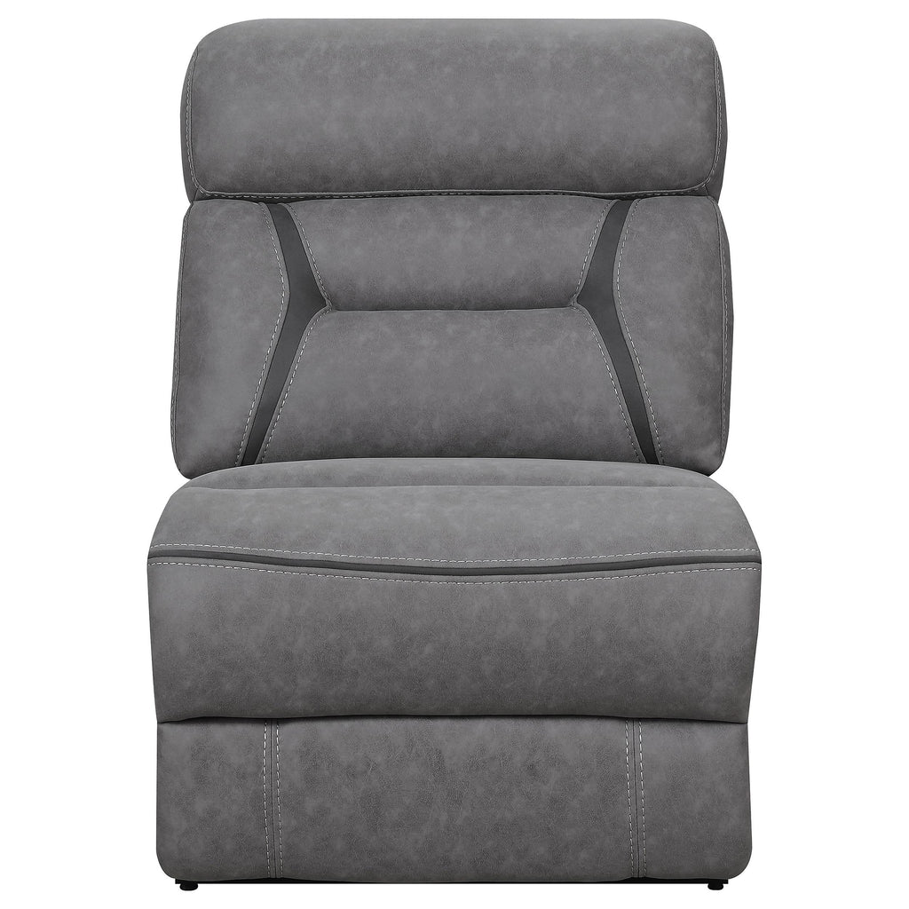 Designed for seamless modular integration, this armless chair expands seating space while maintaining a sleek and cohesive look. Upholstered in soft grey microfiber, it features plush padding and a supportive channel-tufted backrest for enhanced comfort. The armless design allows for flexible configuration within a sectional layout. Built for durability, it ensures long-lasting stability and a cozy seating experience.