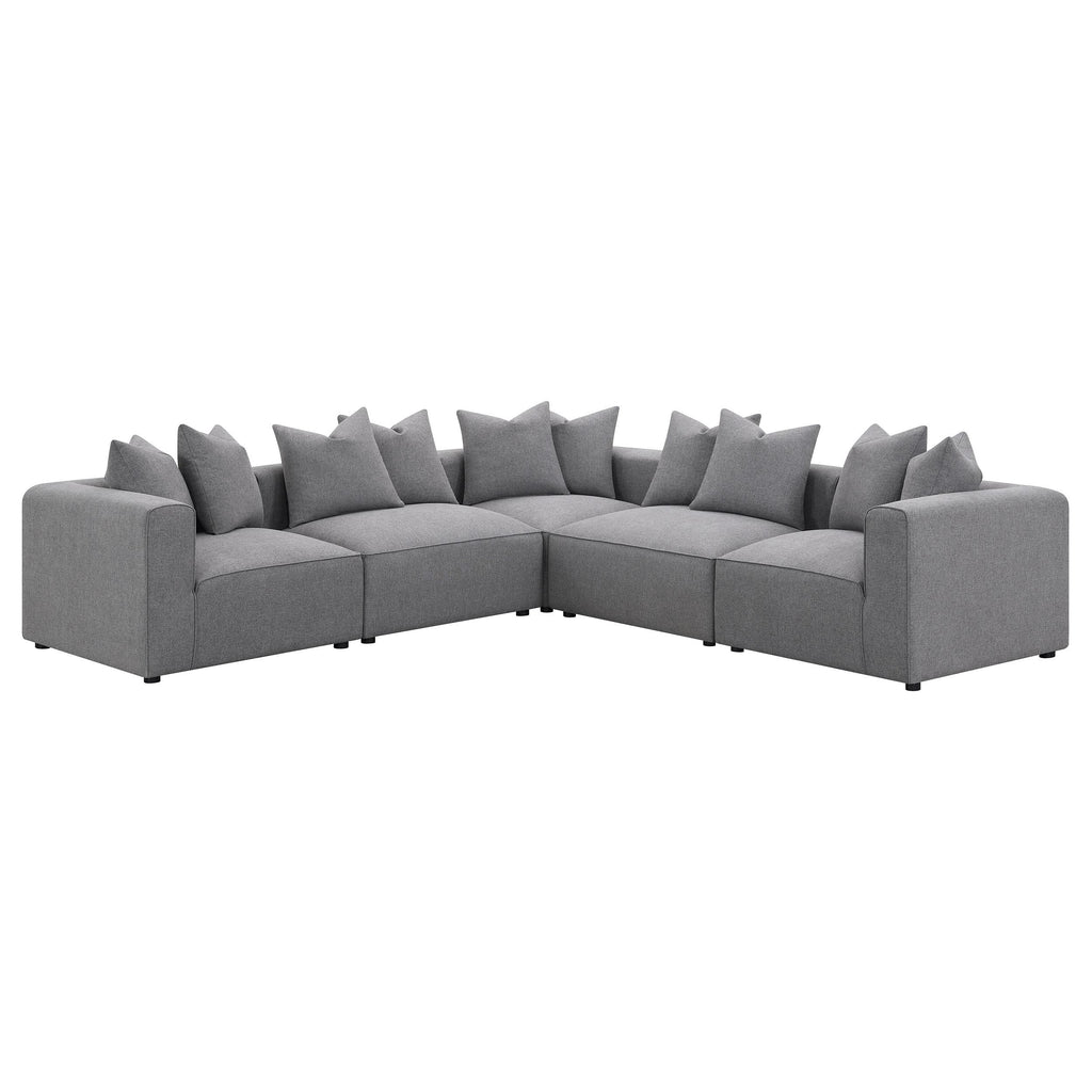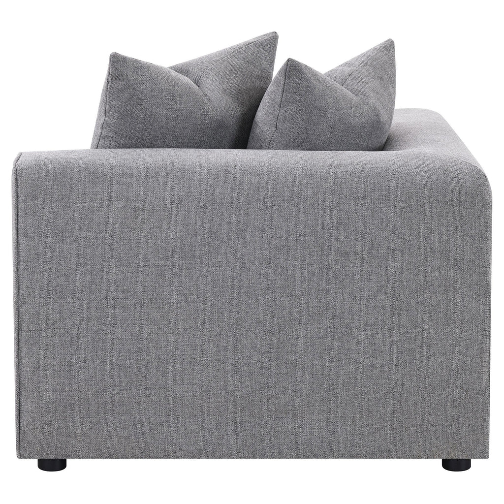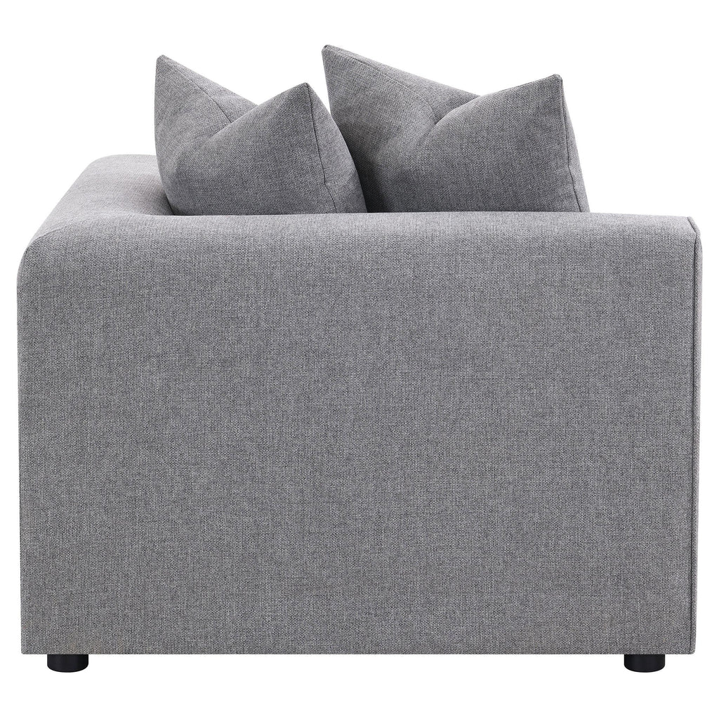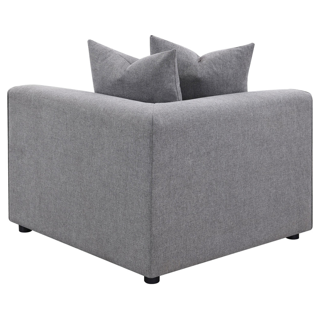 Transform your modular sectional into a L-shaped configuration with this clean and contemporary modular corner chair. With a low-profile design of a track style backrest that doubles as arms, this modular corner chair caps one end of a long sectional sofa and bridges together two main pieces. The tailored tight seat is accented with welt trim along the upper edge. Lending a neutral color palette to enhance with decorative pillows or leave to its sophisticated tone, a soft grey woven fabric brings it all together. Matching pillows offers a plush backing to soften the hard line track back design.
