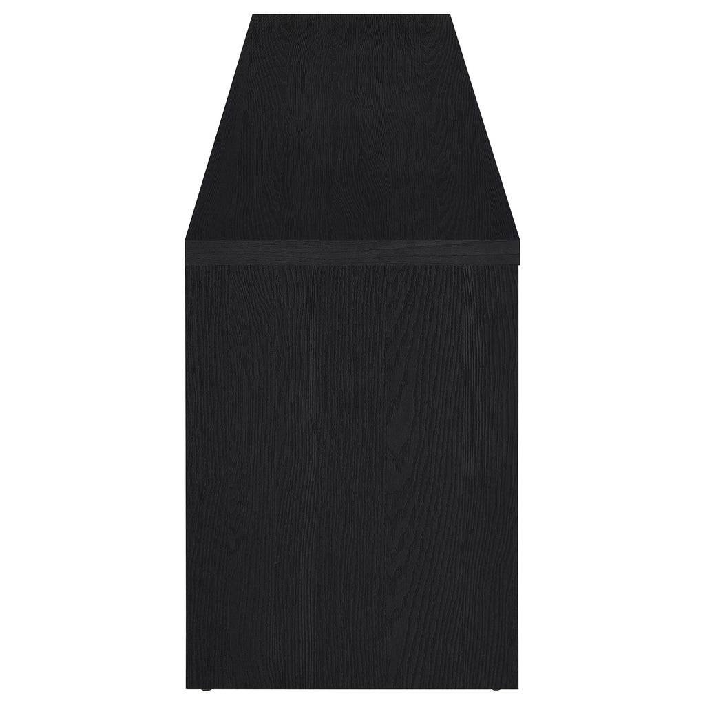 Upgrade your entertainment space with this black TV stand, crafted from engineered wood with a paper laminate veneer for durability and a sleek finish. The clean lines and modern design include open shelves for electronics, a wire management hole to reduce clutter, and three concealed drawers for organized storage. Perfect for flat-screen TVs, this media console combines style and functionality for any contemporary setup.
